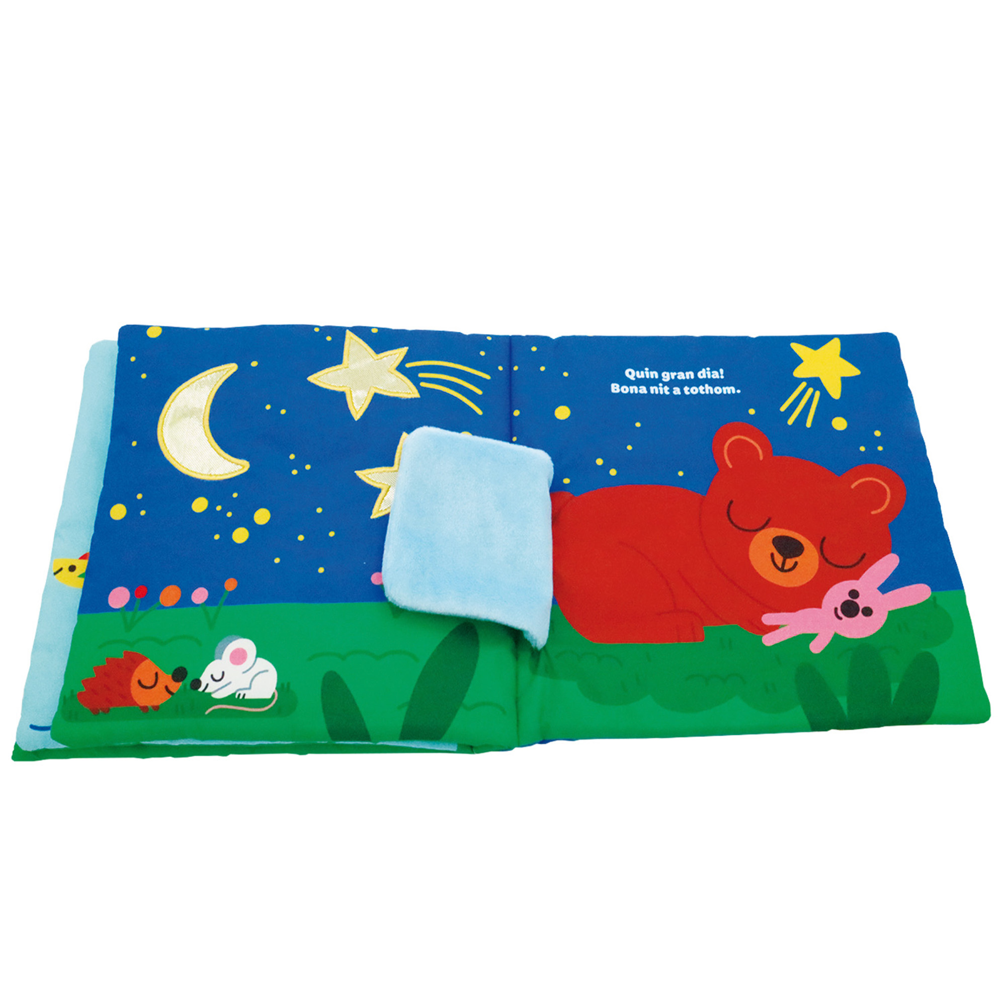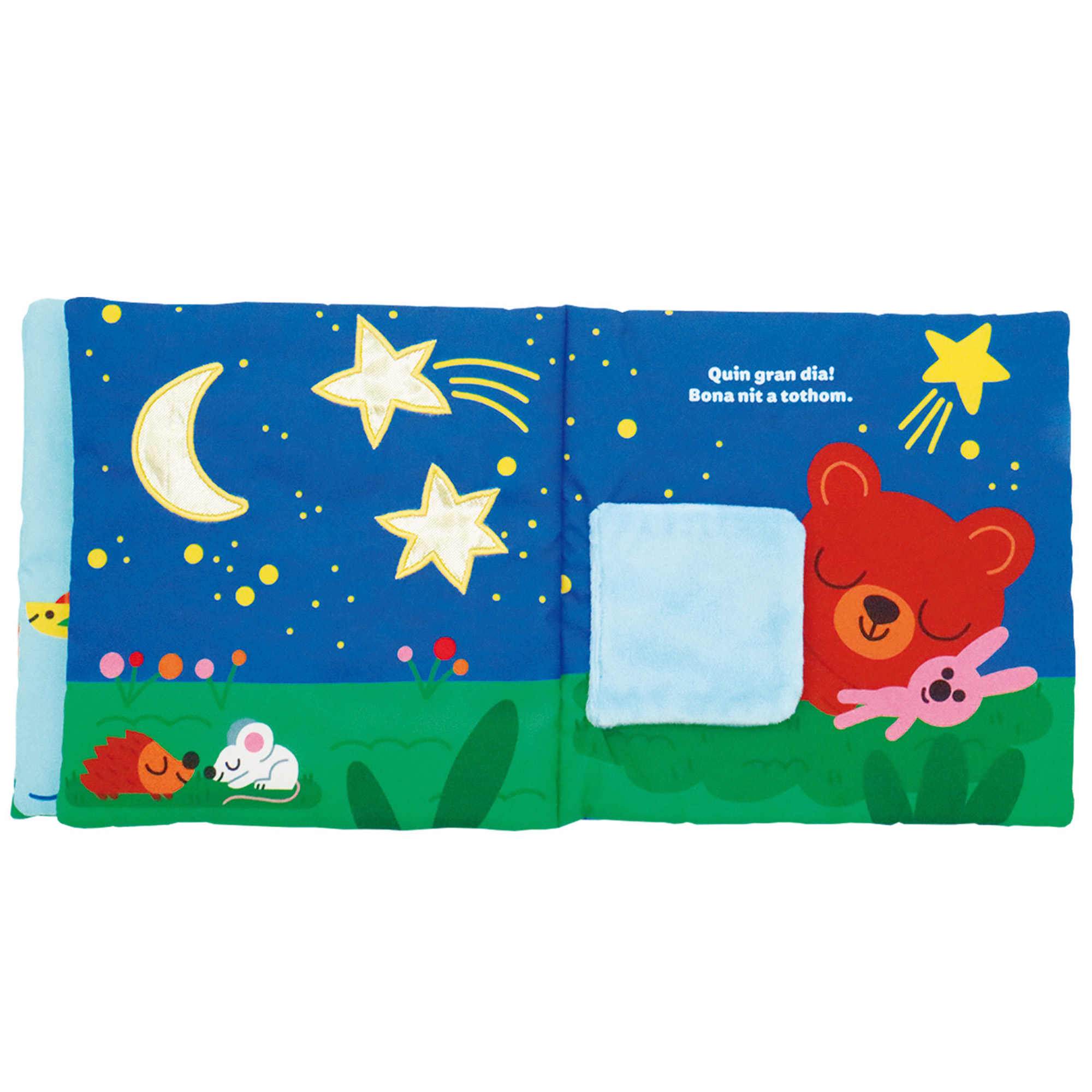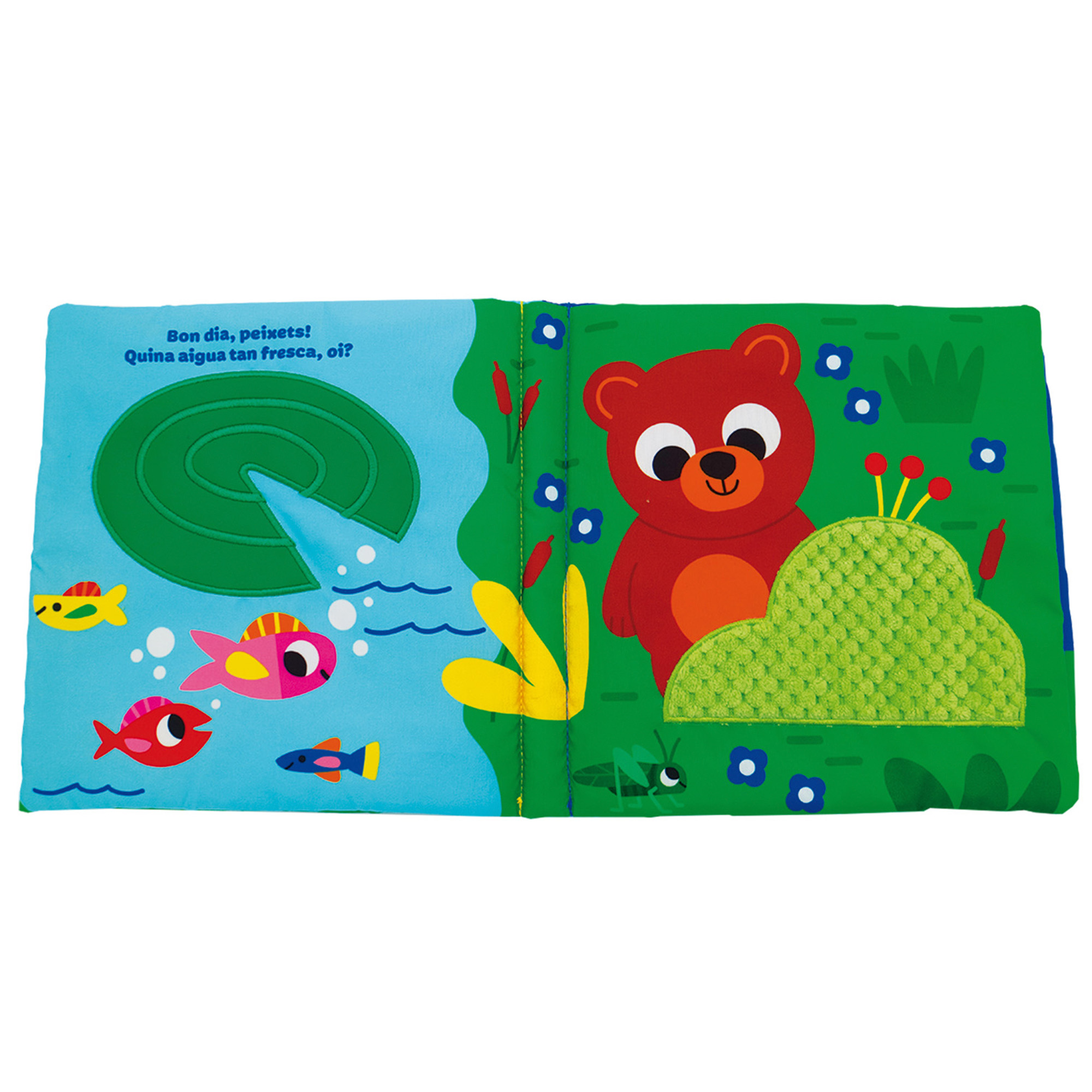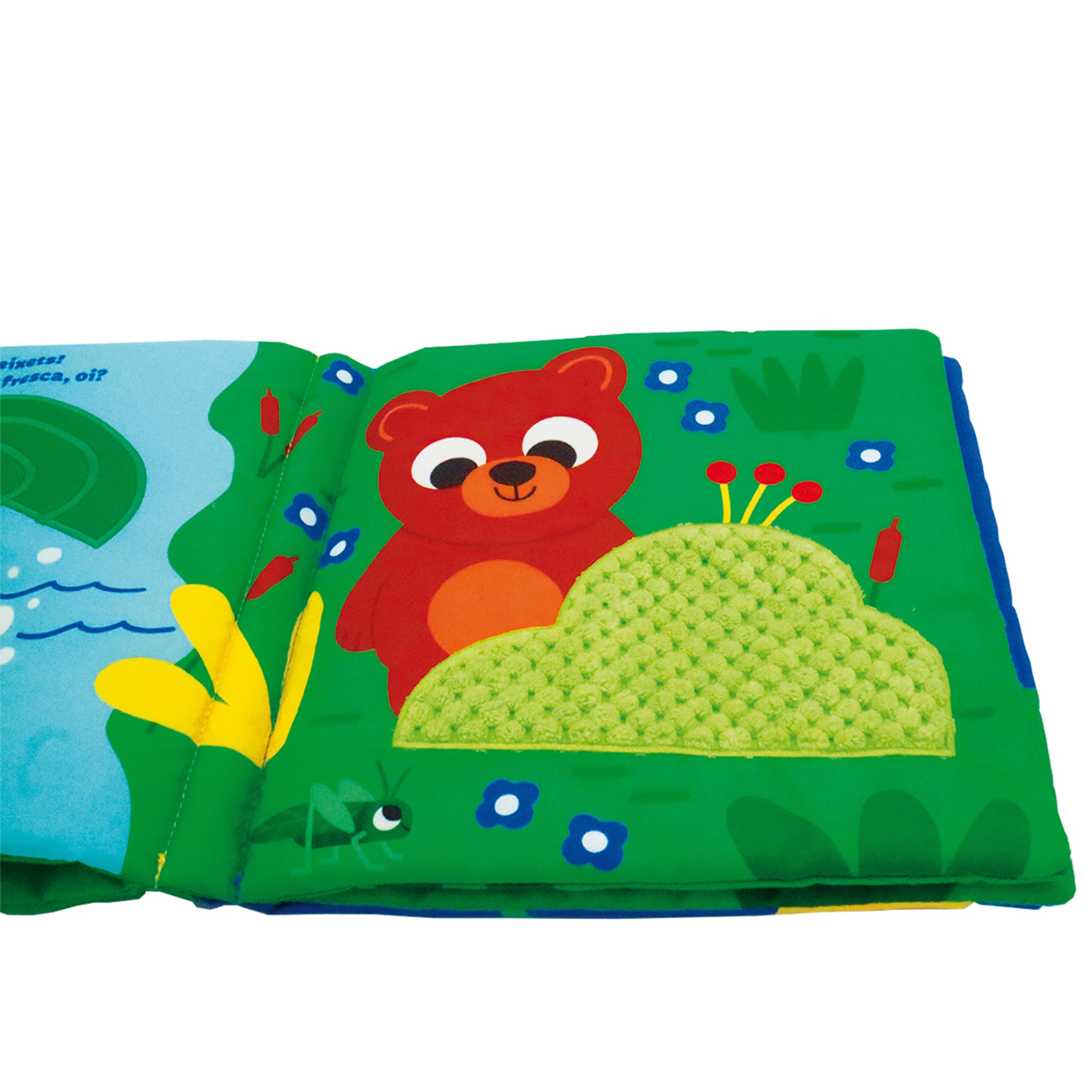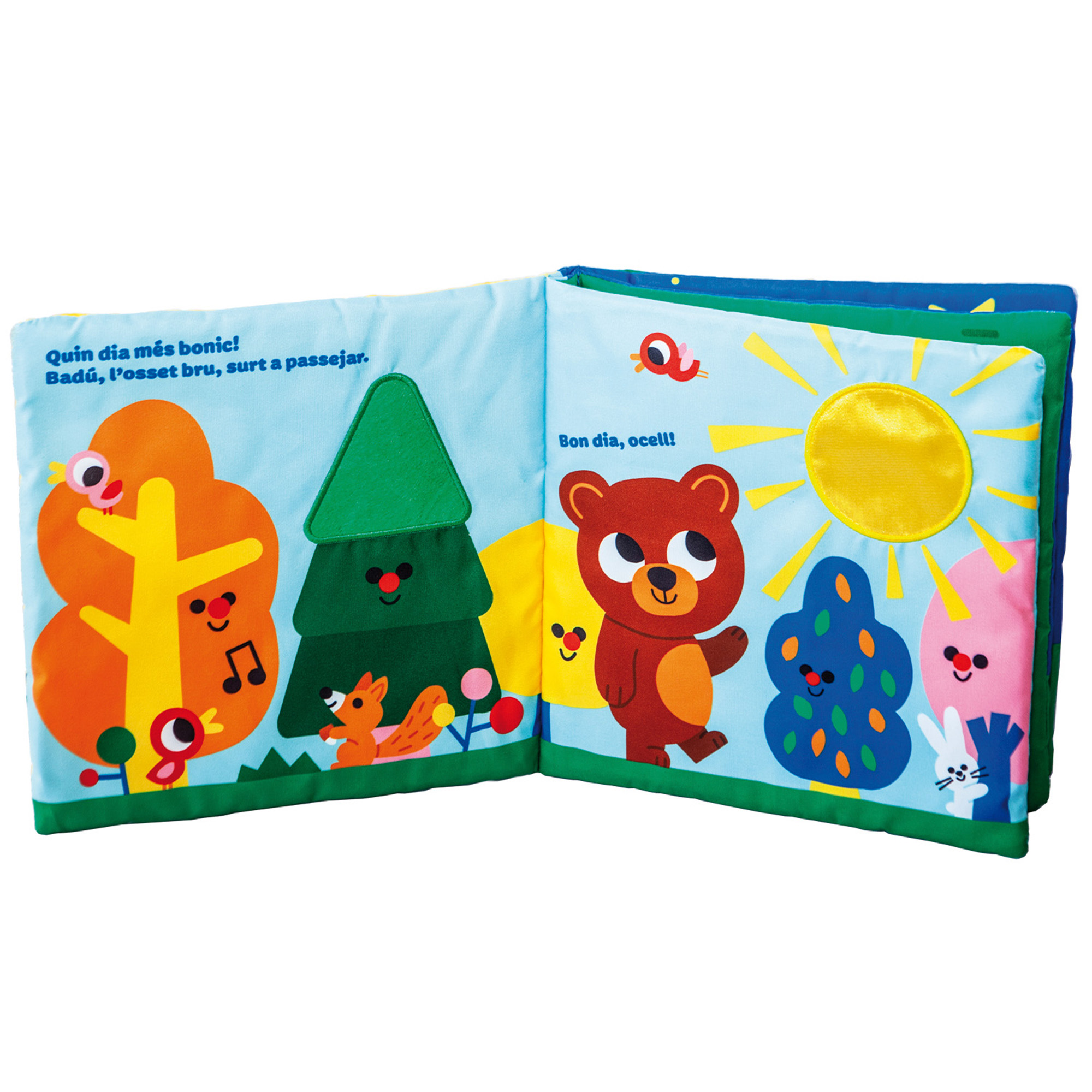Un viatge sensorial amb l’os Badú: un llibre de roba, amb materials per tocar i un mirall a la coberta. Un complet llibre de roba per a l’estimulació sensorial dels bebès.