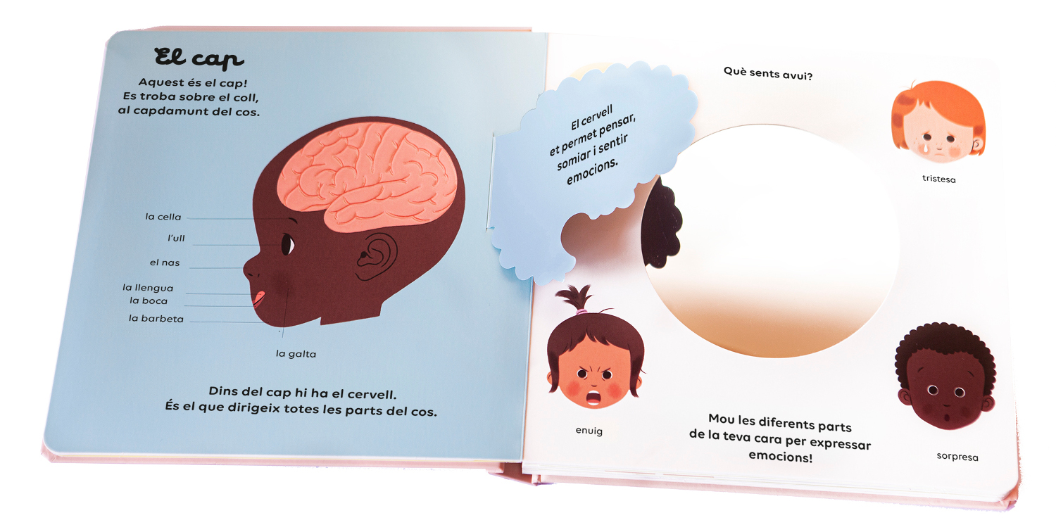 Un llibre il·lustrat, amb textures, solapes i un mirall, que acompanyarà els més petits en el descobriment del seu cos. Amb vint materials tàctils, deu solapes per aixecar i un mirall per observar-se. El llibre presenta una pedagogia lúdica i activa que afavoreix els primers aprenentatges: l’infant reconeix i anomena les parts del seu cos i en descobreix el funcionament.