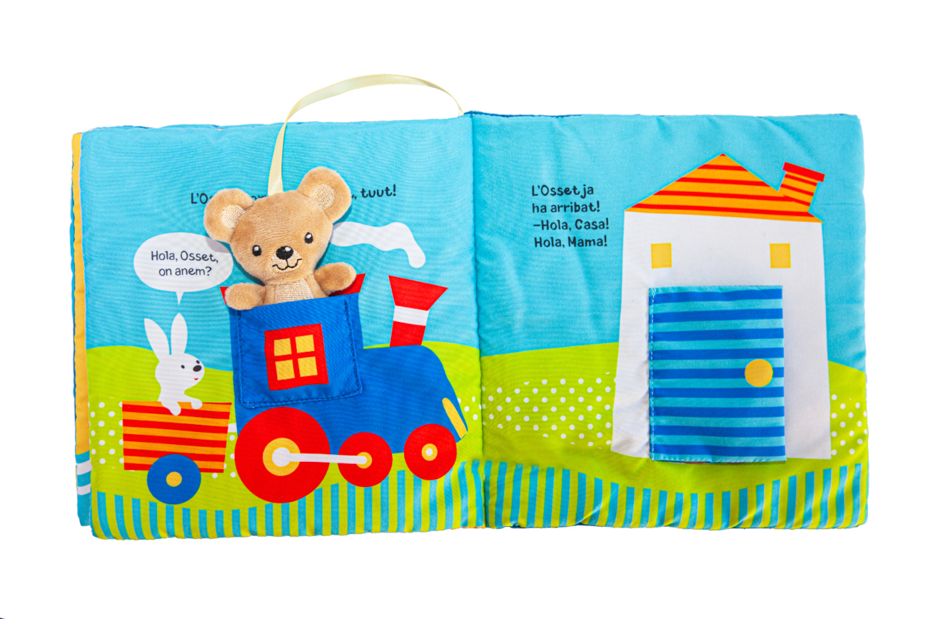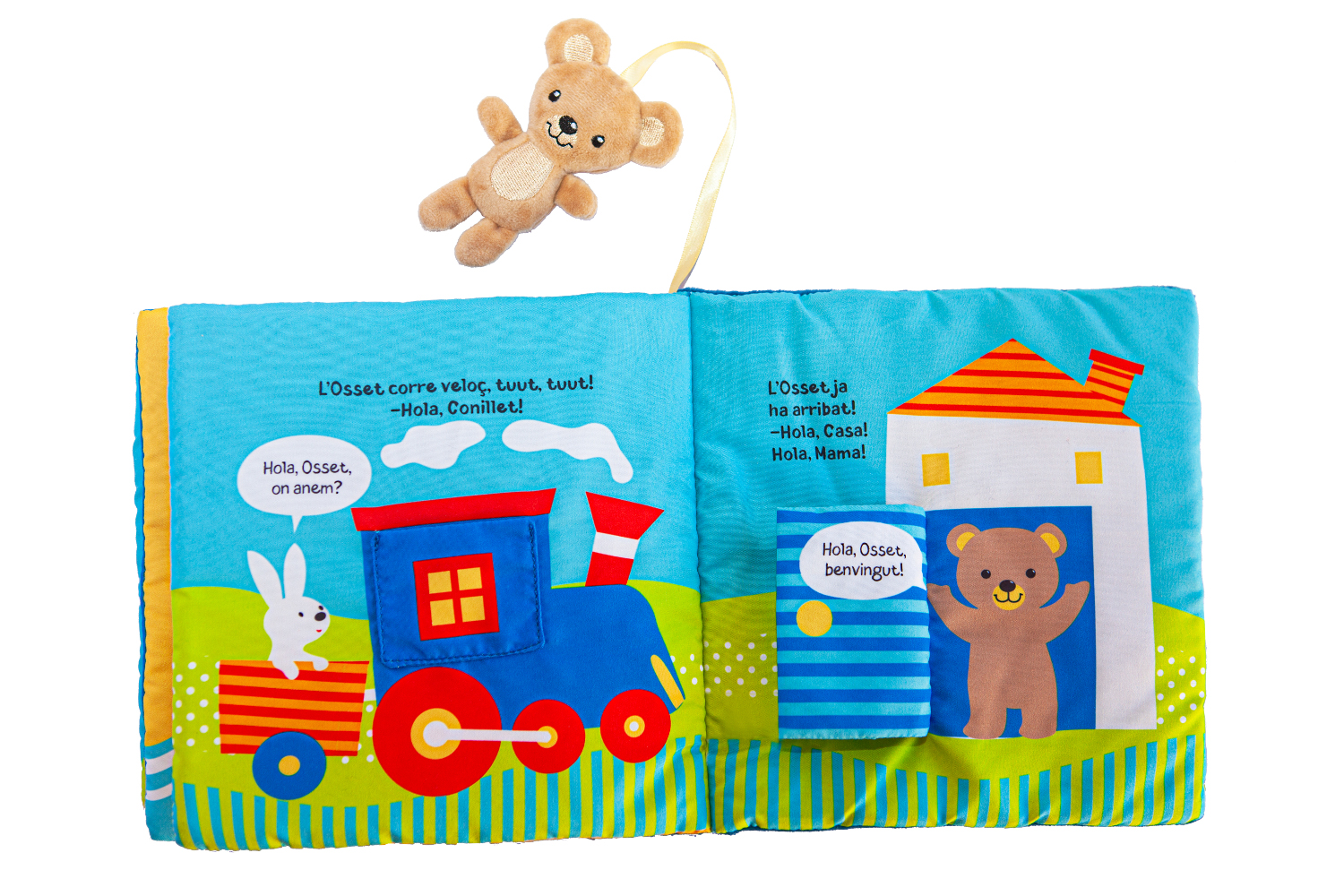 On vas, Osset? Amb el teu nadó, acompanyeu l’osset en un viatge amb tren, amb vaixell o amb avió fins arribar a casa. Un llibre de roba, amb cobertes de vellut i amb un petit nino per a les estones de joc dels més petits.