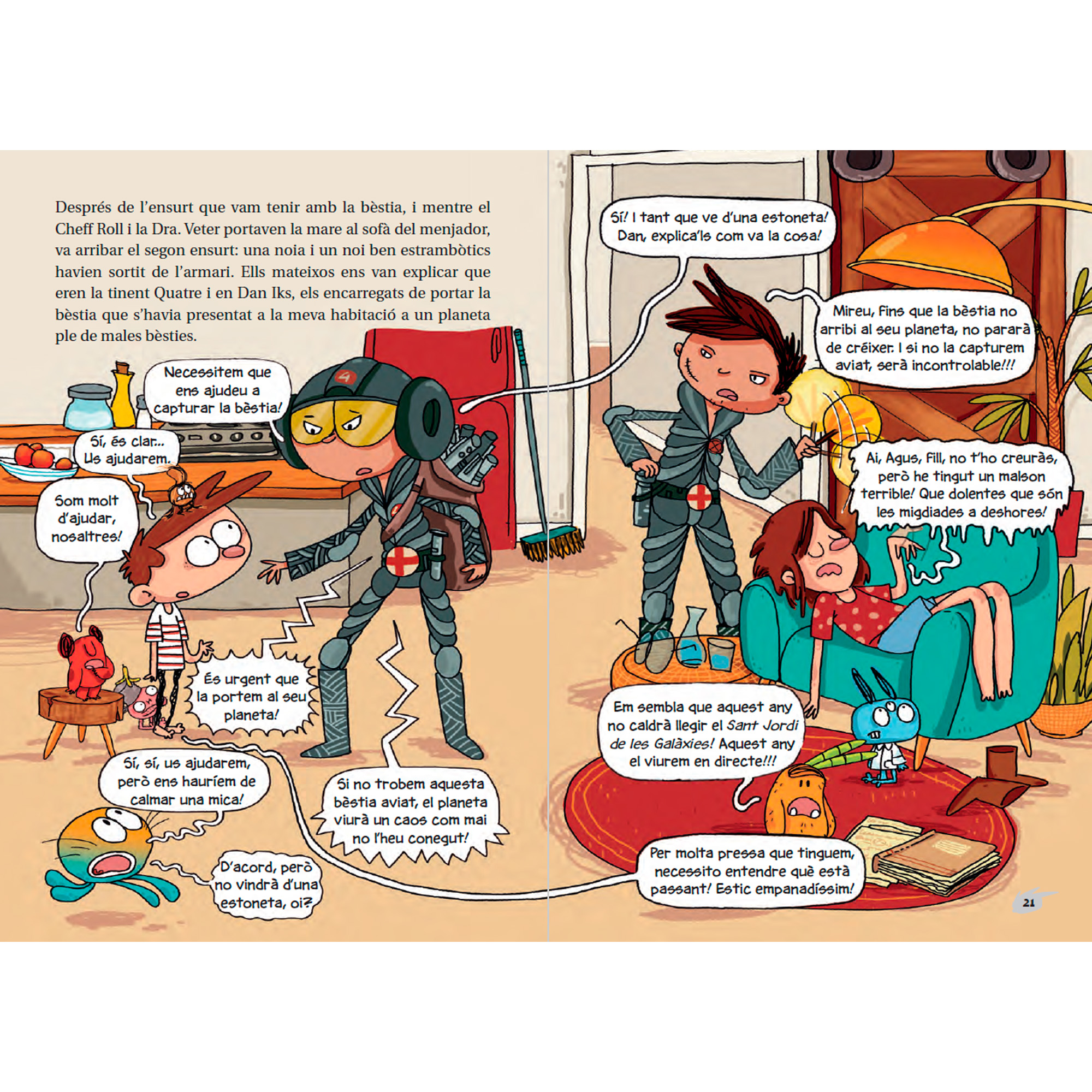 Déu n’hi do, com va anar l’últim Sant Jordi! La mare de l’Agus va obrir un llibre que no havia d’obrir i va alliberar-ne una mena de drac de les galàxies que amenaçava de destruir la Terra. I a sobre, el Dr. Brot i el seu ajudant Nap volien adoptar-lo com a mascota! Sort que ens va arribar de l’espai l’ajuda de la tinent Quatre i en Dan Iks. Regala aquest llibre per Sant Jordi i… que la força t’acompanyi!
