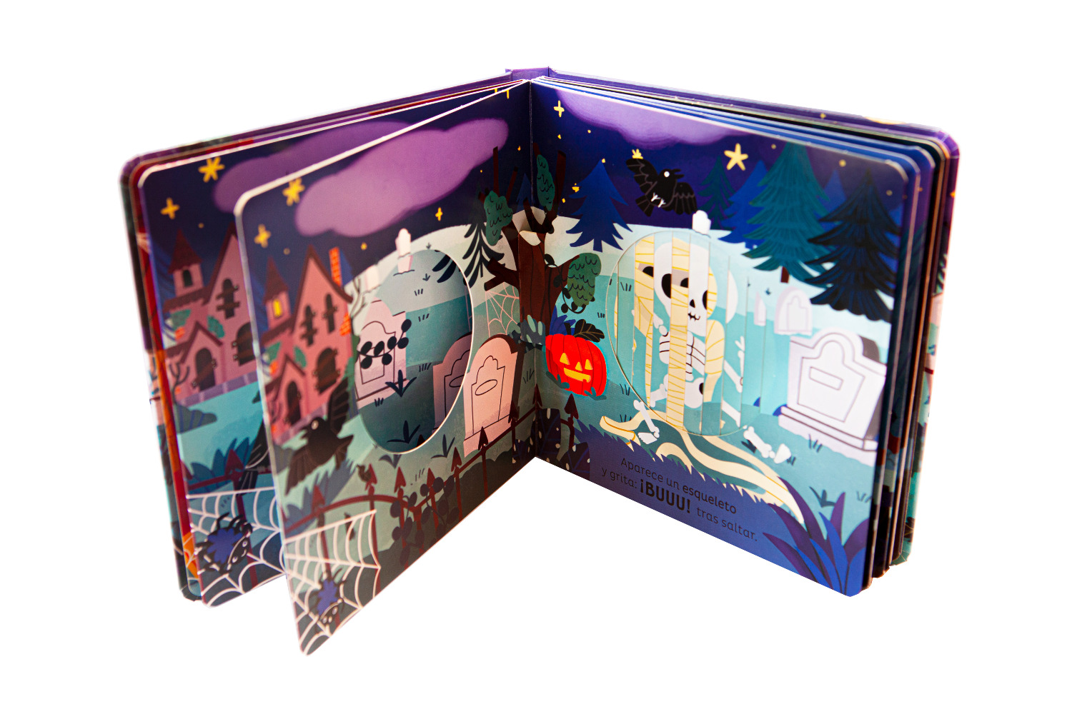 Halloween puede ser muy divertido…, si abrir este libro has elegido. Pasa las páginas para ver algunos personajes espantosos… ¡transformarse ante tus ojos! Un libro todo cartón con un mecanismo de ventanas que cambian para celebrar Halloween con el vampiro, la momia, un esqueleto, el hombre lobo y la bruja.